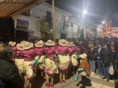 Cependant, une fois passé les célébrations à vocation religieuse, la dimension populaire prend le dessus et la véritable fête peut alors commencer. À l’approche du soir, des stands de nourriture sur le pouce diffusant une alléchante odeur de poulet grillé s’amassent le long de l’allée qui mène à la place centrale. Les vendeurs ambulants prennent leurs quartiers et des empilements de caisses de bières entourent peu à peu l’ensemble de la place. L’une des activités privilégiées de ce genre de fête, c’est la quema de castillo, littéralement, la « mise à feu de château ». Tu l’as peut-être deviné, mais le château désigne ici une structure pyrotechnique à plusieurs étages. Cette construction en bois est fabriquée de manière assez rustique à première vue mais une fois allumé les enchaînements se déroulent sans accroc et le spectacle est vraiment impressionnant. À intervalles réguliers, une nouvelle partie du château s’enflamme et libère des feux d’artifices mobiles et colorés dans un vacarme assourdissant. Il est courant que les jeunes, s’ils sont présents en nombre, se mettent à tourner en se tenant les mains autour du château pendant que celui-ci brûle en faisant tomber une pluie de feu et de cendres. Je me suis joins à cette ronde festive à une reprise et je dois dire que c’est tout à fait exaltant bien que terrifiant à la fois. Le spectacle est accompagné par la musique enjouée de la banda comme pratiquement toutes les activités au programme de la fête. Toutefois, cette dernière peut aussi jouer le rôle principal à l’occasion des bals populaires prévus en soirée (souvent en parallèle du spectacle pyrotechnique) lors desquelles les gens se réunissent entre amis ou en famille pour boire et danser jusqu’à n’en plus pouvoir. En particulier, les gens d’ici dansent le huayno, une danse typique de la sierra péruvienne qui s’est exporté dans le reste du pays et qui peut se danser en couple ou à plusieurs et lors de laquelle le zapateo[10] occupe une place centrale. Mes premières tentatives se sont révélées assez médiocres je dois te l’avouer, mais à force d’entraînement et grâce à l’aide de ma nouvelle amie Ximena* qui s'est révélée être une excellente professeure de danse, je crois que j’ai réussi à progresser un peu. Quel bonheur de sentir mes pieds glisser et taper sur le sol tandis que mes bras se balancent de haut en bas. Je sens la musique vibrer dans tout mon corps et je ne sens bientôt plus le mouvement de mes pieds. Mon esprit s’efface pour laisser mon corps s’exprimer. Je m’oublie. Je m’envole.